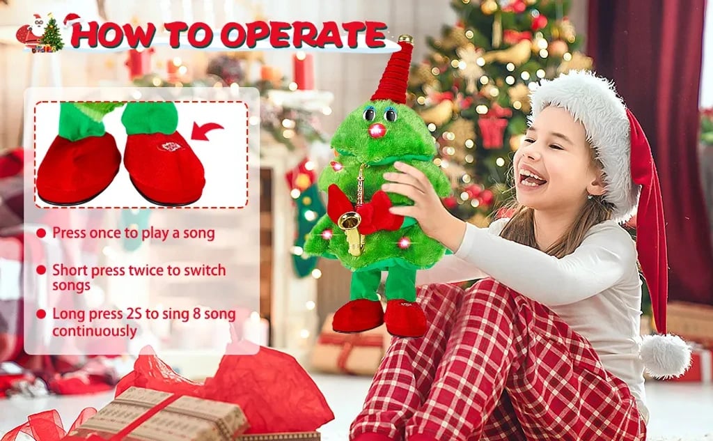 Various styles: There are three different styles of Christmas trees. dancing Christmas tree. saxophone Christmas tree. guitar Christmas tree. Built-in 8 songs are played randomly to satisfy children's entertainment mood.